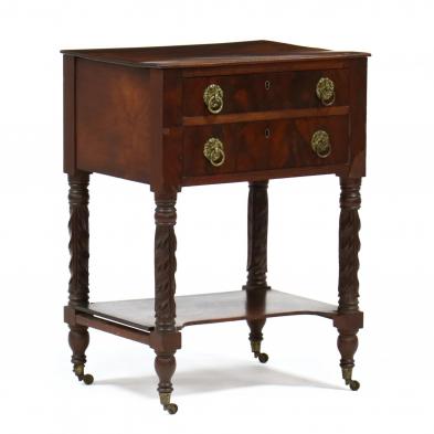 Circa 1840, poplar secondary, two flush drawers, acanthus carved support, lower shaped shelf, on turned feet with brass casters.