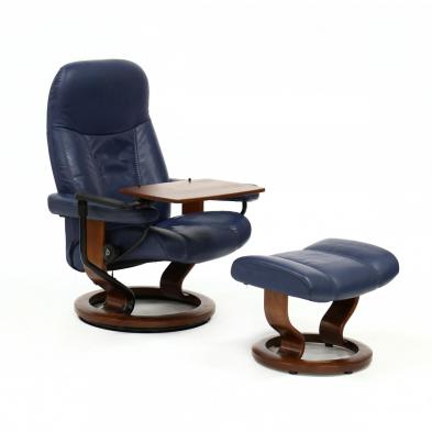 Late 20th century, blue leather, laminated frame with hinged swivel arm tray with adjustable angle, on swivel base, with adjustable back, with conforming ottoman, labeled.