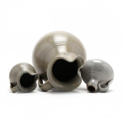 A small jug and two pitchers, Vernon Owen; a lidded pitcher, Bob Armfield; a bowl with sine wave, M.L. Owens.