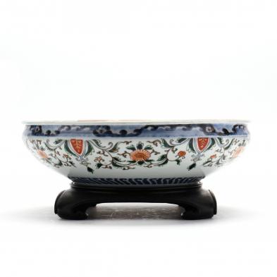 Tale of Genji in flowing court robes on a veranda, center of the bowl has a large basket brimming with flowers, underside has a double rimmed foot, with raised wooden stand.