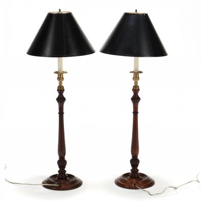 Mid 20th century, turned and carved mahogany with brass mounts, together with Artemis lampshades.