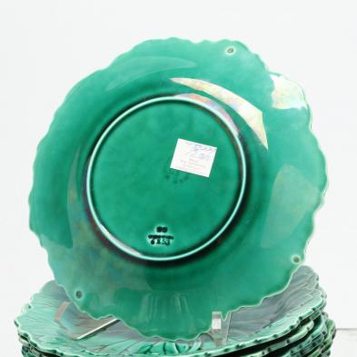 Early 20th century, well molded pottery plates with thick green glaze. Nine plates with three firing stilt marks underneath, stamped on the back: WEDGWOOD" (one with underside chip) (8 in.); ten assorted pattern green plates (four with underside damage) (average size 8.75 in.)