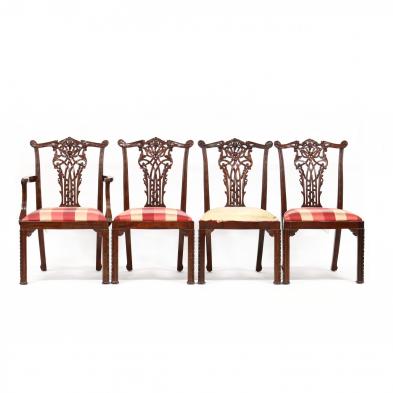 Late 20th century, solid carved mahogany frames, including two arm chairs and six side chairs with shaped and relief carved crest rails, reticulated back with interwoven ribbon carving, acanthus carved knuckles, checkered silk upholstered seats, raised on straight molded legs with carved edges on shaped block feet, labeled.