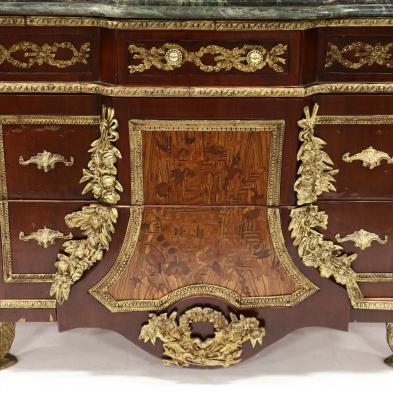 Late 20th century, shaped thick green marble tops with molded edge, frieze with central drawer over two long block-front drawers with parquetry and marquetry inlay and floral bouquet ormolu mounts, concave sides with repeating ormolu mounts, raised on gilt metal acanthus leaf feet.