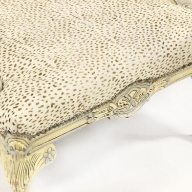Late 20th century, carved and painted frame with printed pony hide upholstery, raised on ball and claw feet.