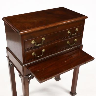Late 20th century, one-part form, hinged lid over two drawers, serving slide, on straight molded legs with marlborough feet.