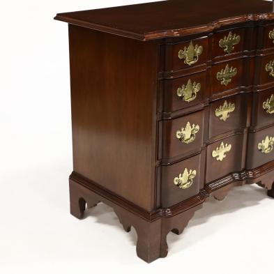 Late 20th century, shaped top with molded edge, over four graduated drawers, scalloped skirt, on shaped bracket feet, labeled.