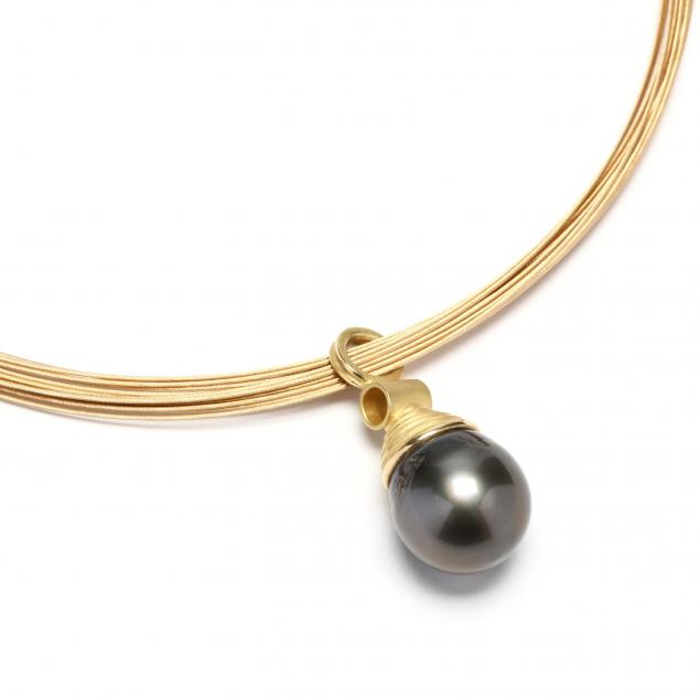 Pendant with one dark gray cultured Baroque drop Tahitian pearl (16.0mm) with a ribbed and matte finish gold cap surmounted with a tube set round brilliant cut diamond weighing approximately .32 carat (F color, VS2 clarity) suspended from the necklace comprised of (14) wire strands and completed with a tongue clasp stamped Germany / 18K and with a maker's mark.
