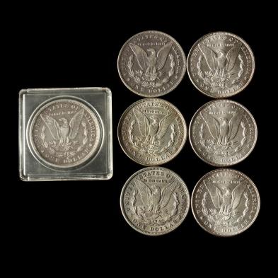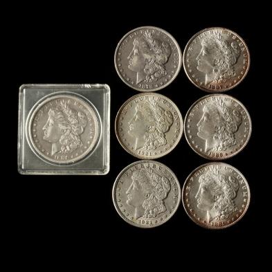 To include: 1878-S (Fine details, cleaned with obverse scratch); 1884-O (Fine details, cleaned); 1885, 1886, 1887 (all BU with obverse toning); 1921 (2 coins, XF details, cleaned, one with obverse scratches).