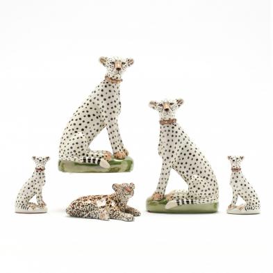 Made in England, a small pair of seated Cheetahs; a recumbent Leopard; a tall pair of Cheetahs, all signed.