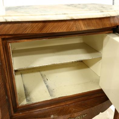 Mid 20th century, painted and designed to appear to be a French classical serpentine front three drawer stand, faux grain painted solid iron, ormolu mounts, with single hinged locking door, raised on cabriole legs, labeled, with key.