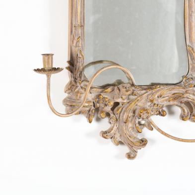 Late 20th century, wood with antiqued painted surface, asymmetrically carved frames, with ho-ho birds, shaped beveled mirrors, with curved arm sconces, labeled.