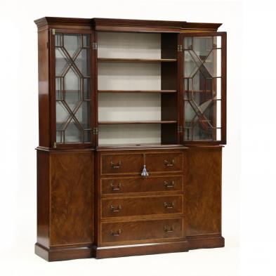 Late 20th century, mahogany, two-part form, upper case with hinged astragal molded individual paned doors, louvered shelf interior, fabric lined, lower case with central fall-front butler's drawer with leather surface and single drawer, over three graduated banded drawers, flanked by two hinged banded cabinet doors with shelved interior, on flush base.
