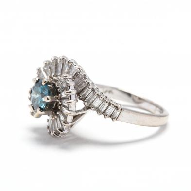 Centering on a prong set blue diamond weighing approximately .79 carat (I1 clarity) and with a baguette cut diamond halo extending to shoulders, stamped 14K. Total baguette diamond weight approximately 2.19 carats (H-I color, SI-I clarity).