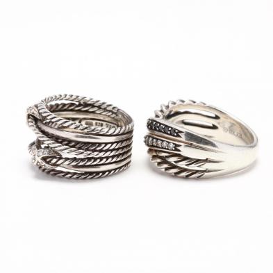The first from the "X" collection with diamond melee accents to each X, stamped 925 and with maker's mark (ring size 8.25); the second from the "Crossover" collection and set with round cut black diamonds weighing approximately .22 total carat and round cut diamonds weighing approximately .33 total carat, stamped 925 and with maker's mark (ring size 10.25).