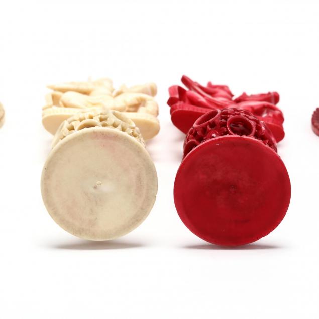 Hand-carved in Canton circa 1820, a large "ball on ball" ivory chess set, one side stained red, the other side natural; each figure is carved from a single piece of ivory on a puzzleball base with six concentric spheres, all carved, without joints; the figures suggest warring Chinese versus Mongols with kings and queens as Emperor and Empress, bishops as mandarins, knights as horsemen, rooks as elephants, and pawns as horsemen.