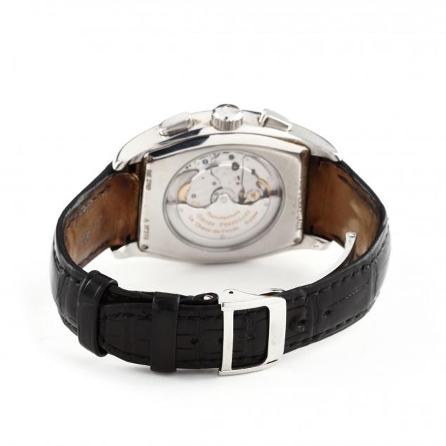Automatic, reference 27650.0.11.1811, the tonneau case with ivory tone dial and applied silver tone Arabic hour markers, with luminescent Alpha hands, date aperture between the 4:00 and 5:00 hour, with sunk subsidiary 30 minute dial, 12 hour register, and instant seconds, with skeleton crystal back, completed with a black leather strap band with concealed deployment clasp, case reverse signed and stamped Ref. 2765 / A No 370.
