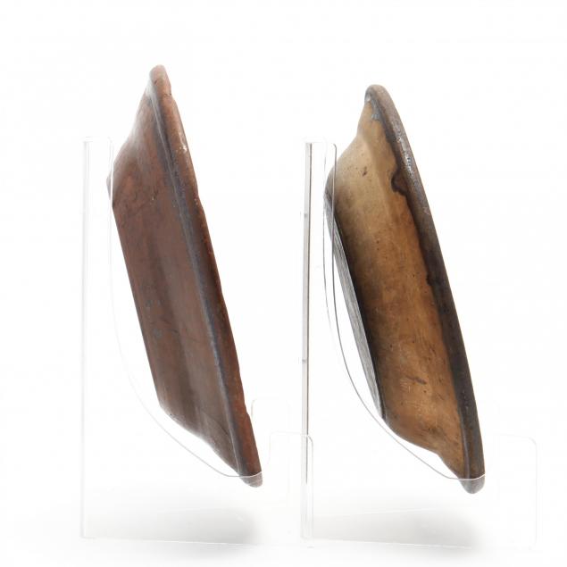 From the Collection of the late Bragg Cox, Cary, North Carolina Flaking glaze; one with expected blackening, the other with heat hairlines which appear stable; rim chips.