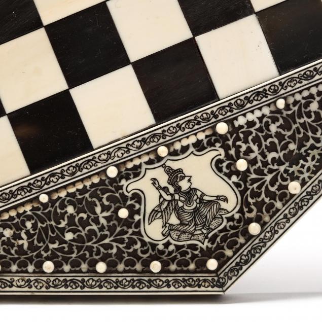 19th century, octagonal top with dyed black and white checked ivory veneers, intricately carved fretwork panels with Southeast Asian figures, turned ebony standard with ivory inlays, quadruped base with repeating carved fretwork and dyed decoration to border raised on carved bone paw feet.