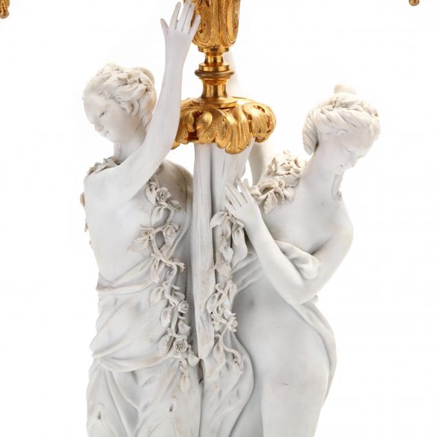 Late 19th century, depicting two Graces in a ritual dance below four lights with biscuit bobeche, the whole raised on a truncated stepped column form base with gilt paw feet, inscribed by a maiden's foot, intertwined "L" and "Lagneau".