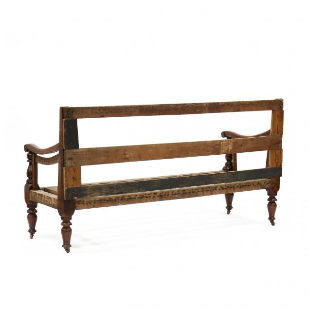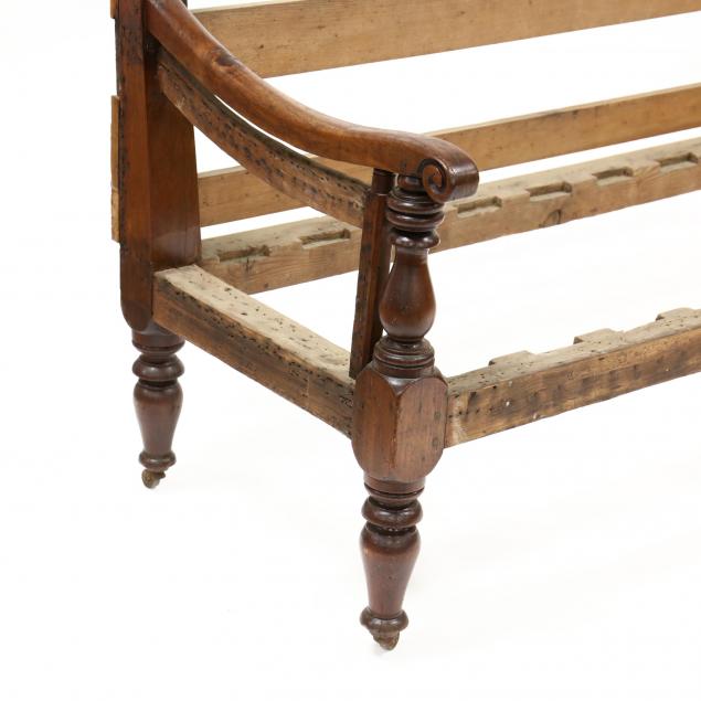 Attributed to Petersburg, Virginia, circa 1830, yellow pine and white pine secondary, frame without upholstery, rear tapered stiles, downswept arms with scrolled knuckles, with baluster and ring-turned arm supports, turned and tapered legs, on casters.