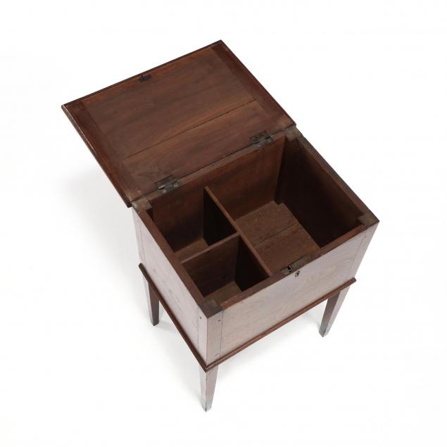Attributed to North Carolina, early 19th century, poplar secondary, rectangular hinged top with breadboard ends and lower molded lip, interior with three compartments, flush case, base with applied molded trim, raised on tall square tapered legs.