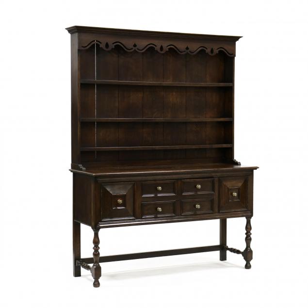 Circa 1900, two part form, upper open shelf with reticulated scalloped frieze with three dish shelves, lower cabinet with two drawers flanked by raised panel cabinet doors, raised on turned legs with stretcher base.