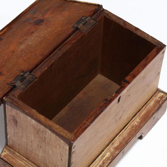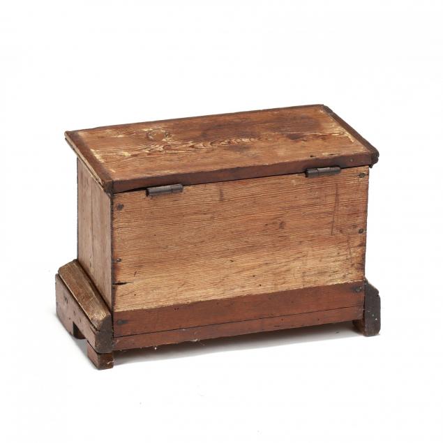 19th century, yellow pine with remnants of old paint, hinged lid with applied molded edge, open interior, raised on applied block bracket feet.