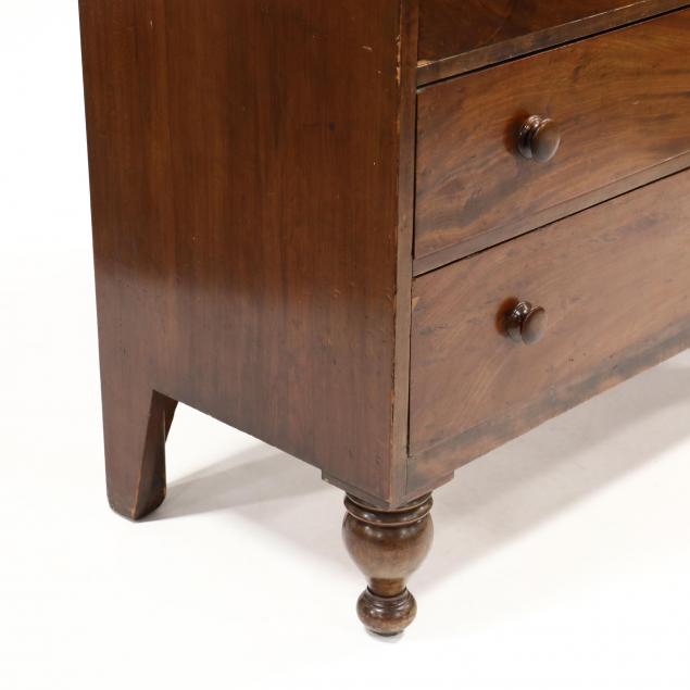 Mid 19th century, likely Southern, poplar and white pine secondary, cherry top and sides, case with mahogany veneered drawers featuring two upper side-by-side drawers over a recessed banded bonnet drawer over three graduated drawers, flush sides, raised on front turned feet.