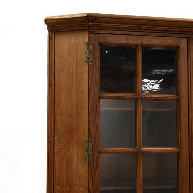 Attributed to Gates County, late 18th century, one-part form, applied stepped cornice; two upper hinged doors with molded mullions and eighth window panes each, applied waist molding, two lower cabinet doors with raised panels, interior with single shelf, canted corners with applied picture molding, stepped molded flush base.