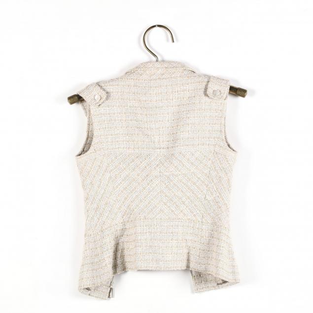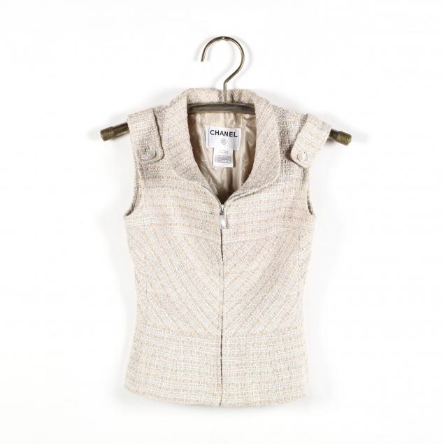 1990s, featuring epaulets, zip front, fitted bodice and waist, composed of a blend of cotton, linen and wool, with CC detail on the mother-of-pearl buttons, "Chanel" embossed on the zipper pull, lined with a Camellia pattern fabric.