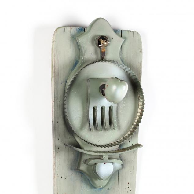 Comprised of a circa 1900 pine ironing board with metal, wood and porcelain objects in a light green painted surface, ink signed to lower right side edge.