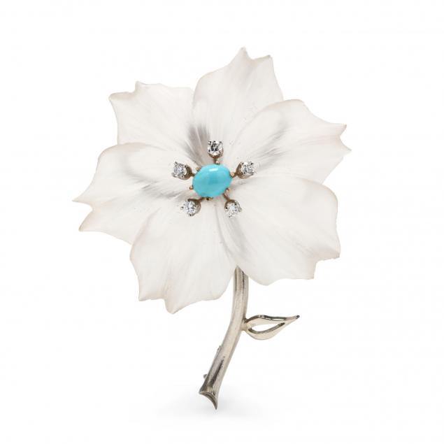A carved frosted crystal flower brooch set with an oval cabochon turquoise surrounded by full cut round diamonds weighing approximately .25 total carat (H-I color, VS-SI clarity) and a white gold leaf and stem, with maker's marks and stamped 585.