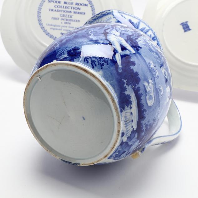 19th century, a Staffordshire pitcher of a boy luring a young lady with his flute; a plate with scene of figure roping cattle; a 19th century small Spode plate; and a contemporary Spode "Greek" plate.