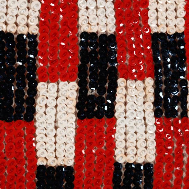 Some losses to sequins and small thread pulls; discoloration at sequin attachment, mainly to the white sequins.