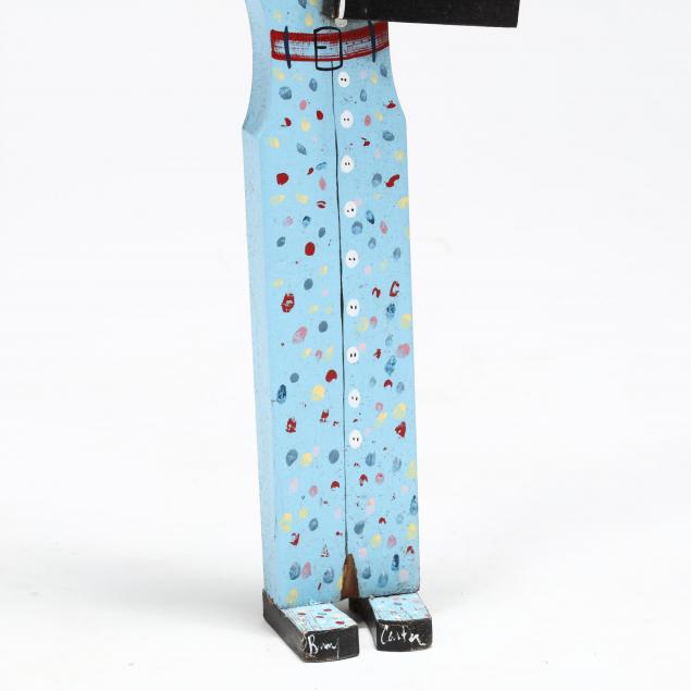 Wood-cut outs with paint: a figural representation of Sam McMillan as the Statue of Liberty attired in a dot decorated suit (43 in.) (some loss to the surface of the book); a bird house painted with allover Benny signatures against a white field, tin roof, a snake approaches the aperture (rough construction as made; peeling paint to the overhang) (22.5 x 4.5 in.) Included in this lot is a photograph of Benny Carter posing with Sam, signed by Benny, framed and matted under glass.
