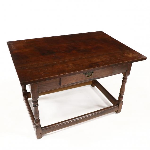 19th century elements, yellow pine secondary, rectangular three board top, case with a single drawer, pegged turned legs with stretcher base.