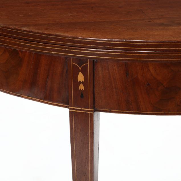 Concord, circa 1810, attributed to Robert Choate and George W. Martin, mahogany veneers, white pine secondary, hinged lid with gateleg support, double line lightwood inlay to top edges, veneered skirt with lightwood line inlay at base, upper stiles with inlaid graduated bellflowers over a darkwood inlaid teardrop, tall square tapered legs with line inlay and lower inlaid cuff.