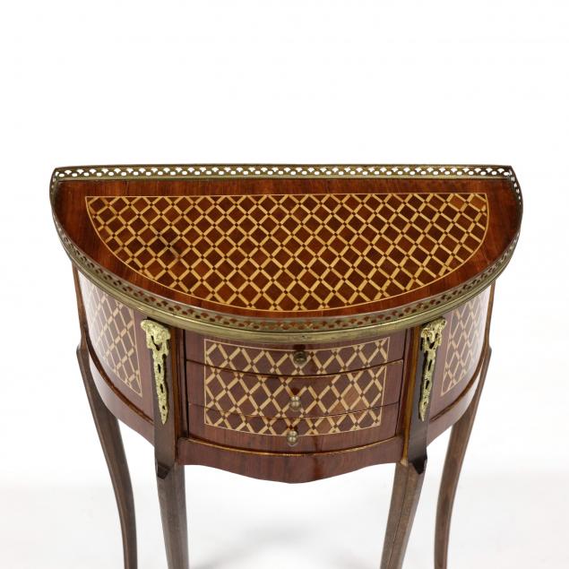 Late 20th century, mixed wood veneers in a diamond pattern, reticulated brass gallery, cabinet with three drawers, ram's head ormolu mounts, raised on tall cabriole legs.