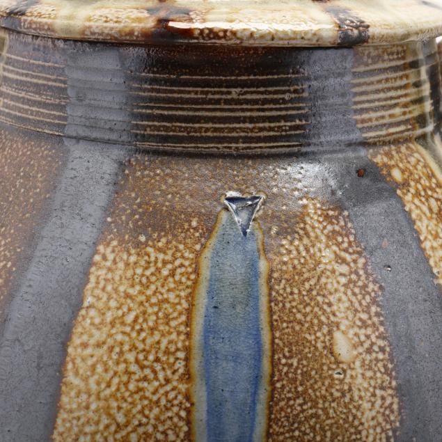 Salt-glazed and wood-fired, both with glass runs and lids, both with stamped signature glyph on the bottom and firing number.