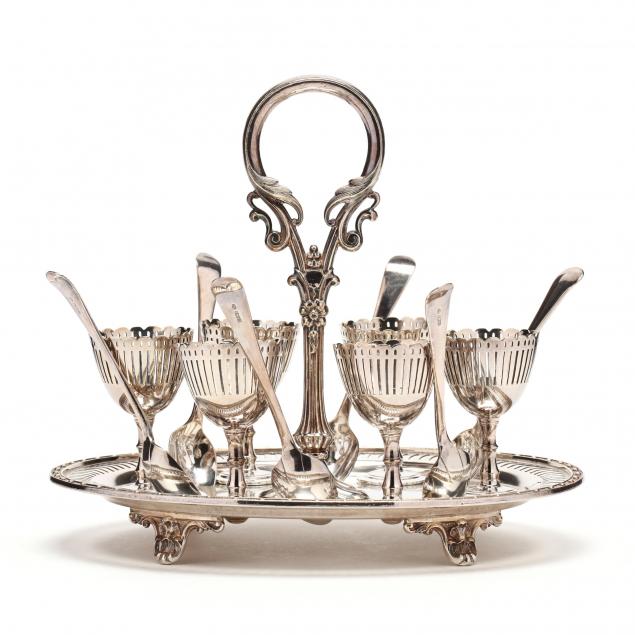 Late 19th century, with six egg stands and six spoons, the oval stand and the egg cups with reticulated decoration.
