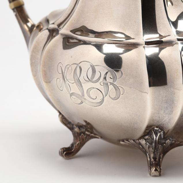 A four piece set including a coffee pot (9.25 in.), teapot, sugar bowl with cover, and creamer. Each with period script monogram "NLB."