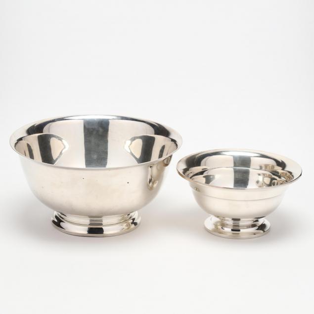 The first by Gorham, model number 41660, 1950 date symbol, engraved "In Appreciation of / Gawthorn Asbury Bowen / Church - School Editor for Twenty Seven Years / Presented by / The Board of Publication / of / The Methodist Church / September 9, 1952" (4.5 x 9 in. diameter); the second a colonial style bowl without monogram or engraving (3.25 x 6.5 in. diameter).