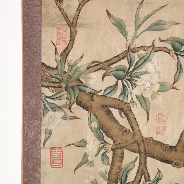 Contemporary, ink and colors on paper, hanging scroll format with brocade border, a hand colored printed image of a bird on prunus branch, with numerous collector seals in all areas of the image including Qianlong emperor seals, calligraphy to the right hand side of image.