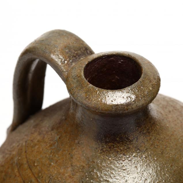 19th century, salt-glazed stoneware, a one gallon jug so stamped with two bands of tooling to the shoulder (base chip); a one gallon jug with grooved handle, flat rim (flea bit at rim; minor base roughness); a jug with two bands of tooling, large kiln drip, grooved handle (inside spout chip).