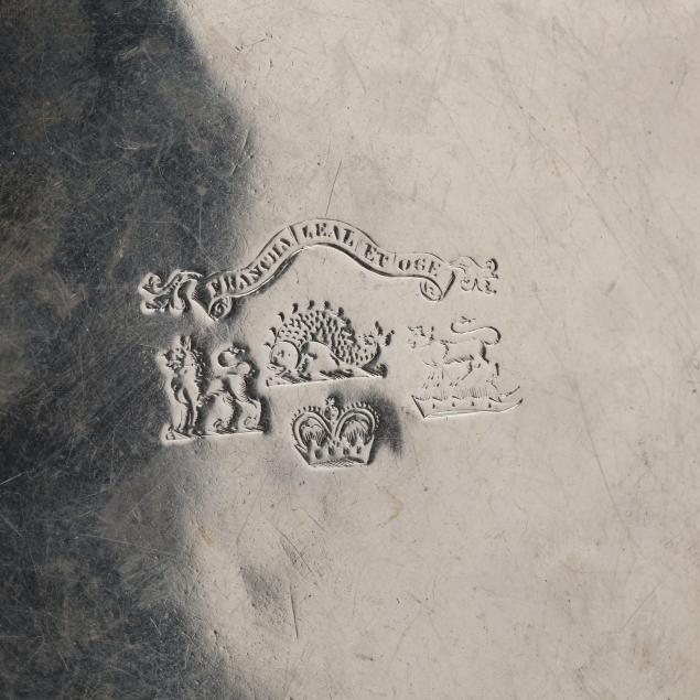 Mark of Ebenezer Coker, London (1761), border in the Rococo style with shells and scrolls, raised on three hoof feet, central armorial engraving of the period and featuring the motto "Francha leal et oge."