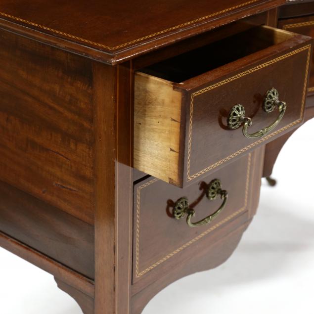 Circa 1900, bowfront form, with herringbone banded inlay, case with five drawers, paneled sides, raised on square tapered legs with line inlay, on casters.