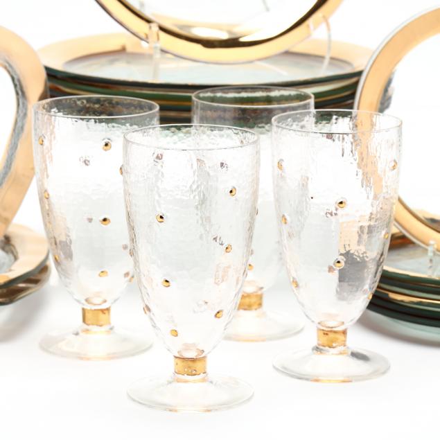 1980s, including (15) Annieglass gilt rim dishes and (6) Smyers Glass signed polka dot glasses.