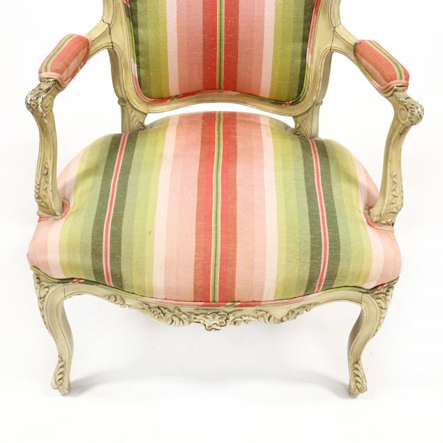 Circa 1900, finely carved frame with an antiqued white painted surface, striped silk upholstery.