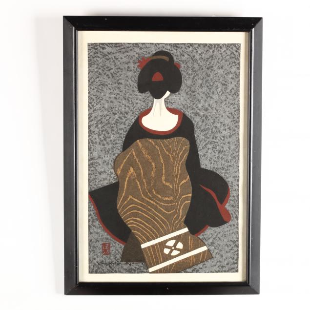 Ink and colors on paper, two portraits of a maiko or young geisha from Kyoto, with artist's signature under his artist's seal on each print, in these images Saito has simplified the forms to great effect and used the wood patterns to add texture and interest to his design, they are both framed, not examined outside of the frame.